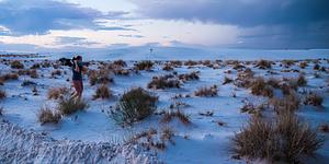 Walking with a purpose across the soft, white sand. The gentle post-sunset glow illuminates the landscape, hinting at the creative endeavor to capture the evening's unfolding beauty.
