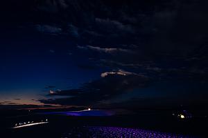 As the night deepens, the sky reveals a tapestry of stars. The headlights of a moving vehicle create a streak of light, while a lone, illuminated tent and the distant glow of the musicians' stage stand as small beacons of human presence in the immense, dark landscape.