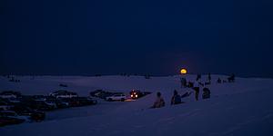 The main event begins as a brilliant, orange harvest moon rises above the horizon, casting a warm glow over the landscape. Spectators, having found their perches on the dunes, watch in awe as the celestial performance starts.