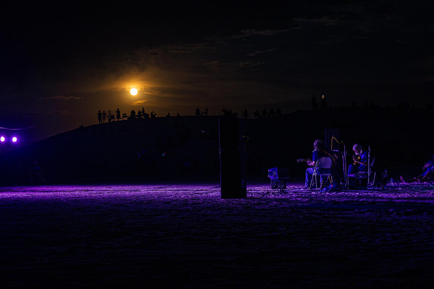 Two musicians, bathed in purple stage light, provide a live soundtrack to the celestial show. The rising full moon hangs in the dark sky above a crowd of onlookers silhouetted on a distant dune, creating a magical, multi-sensory experience.